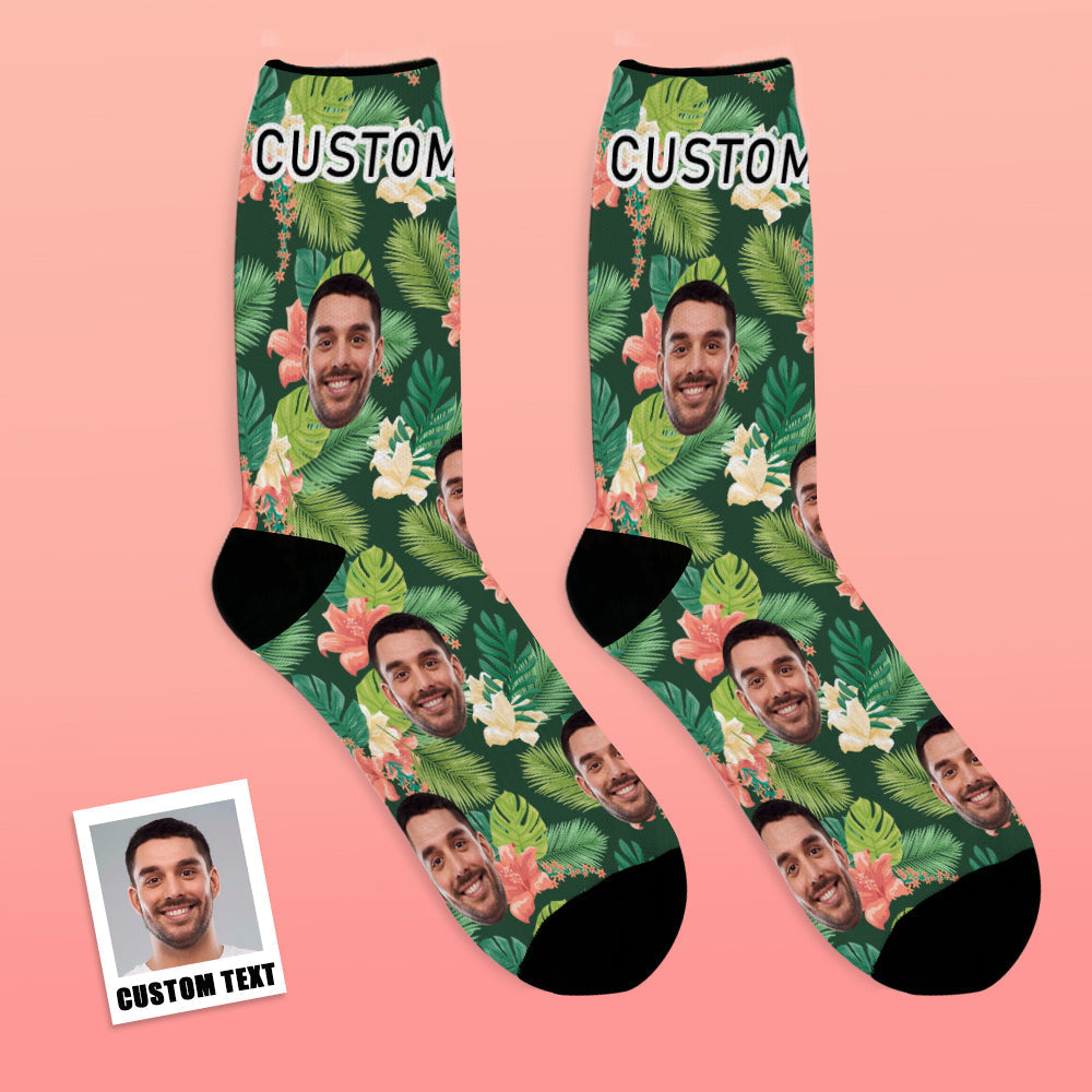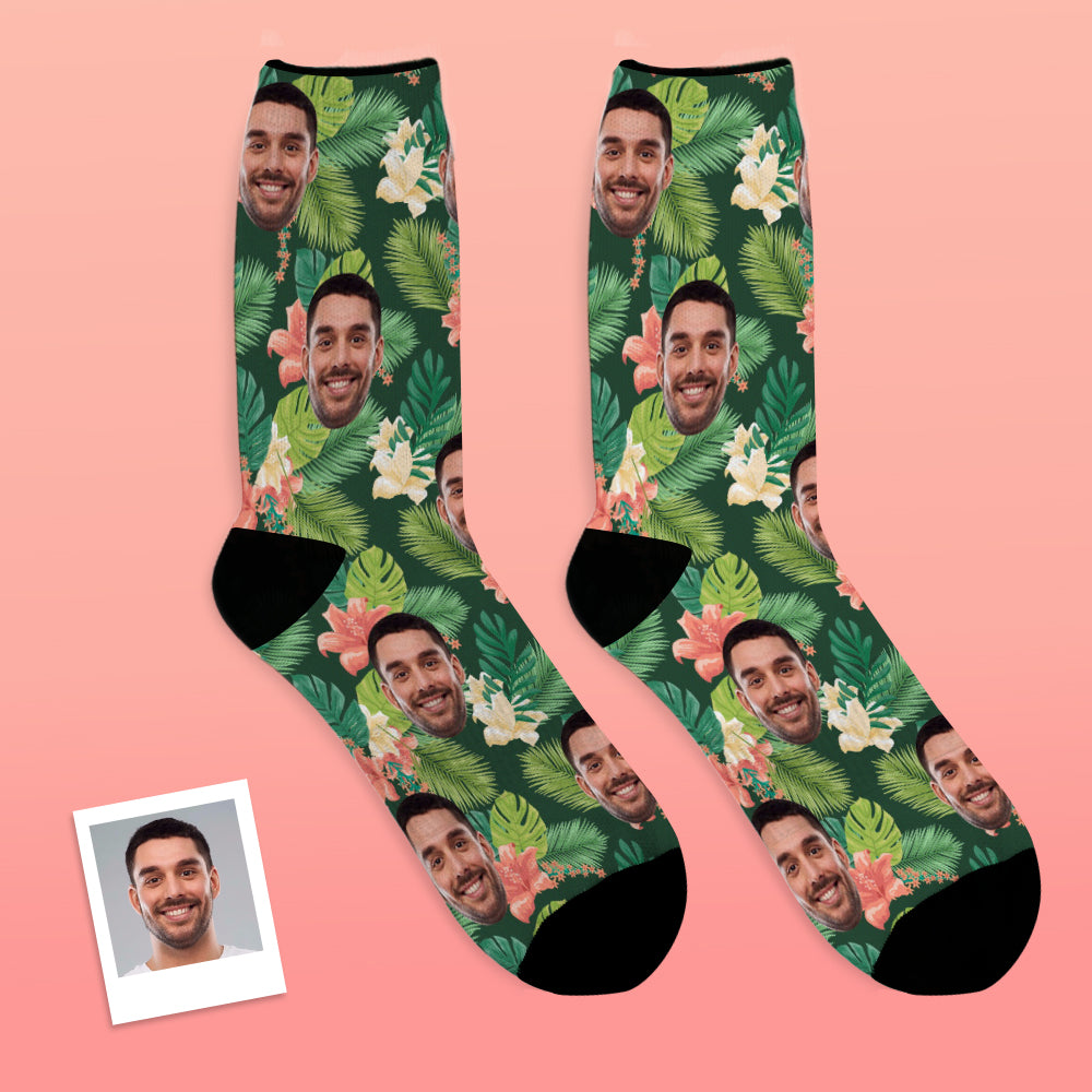 Custom Face Hawaiian Socks With All Over Print Leaves And Flowers