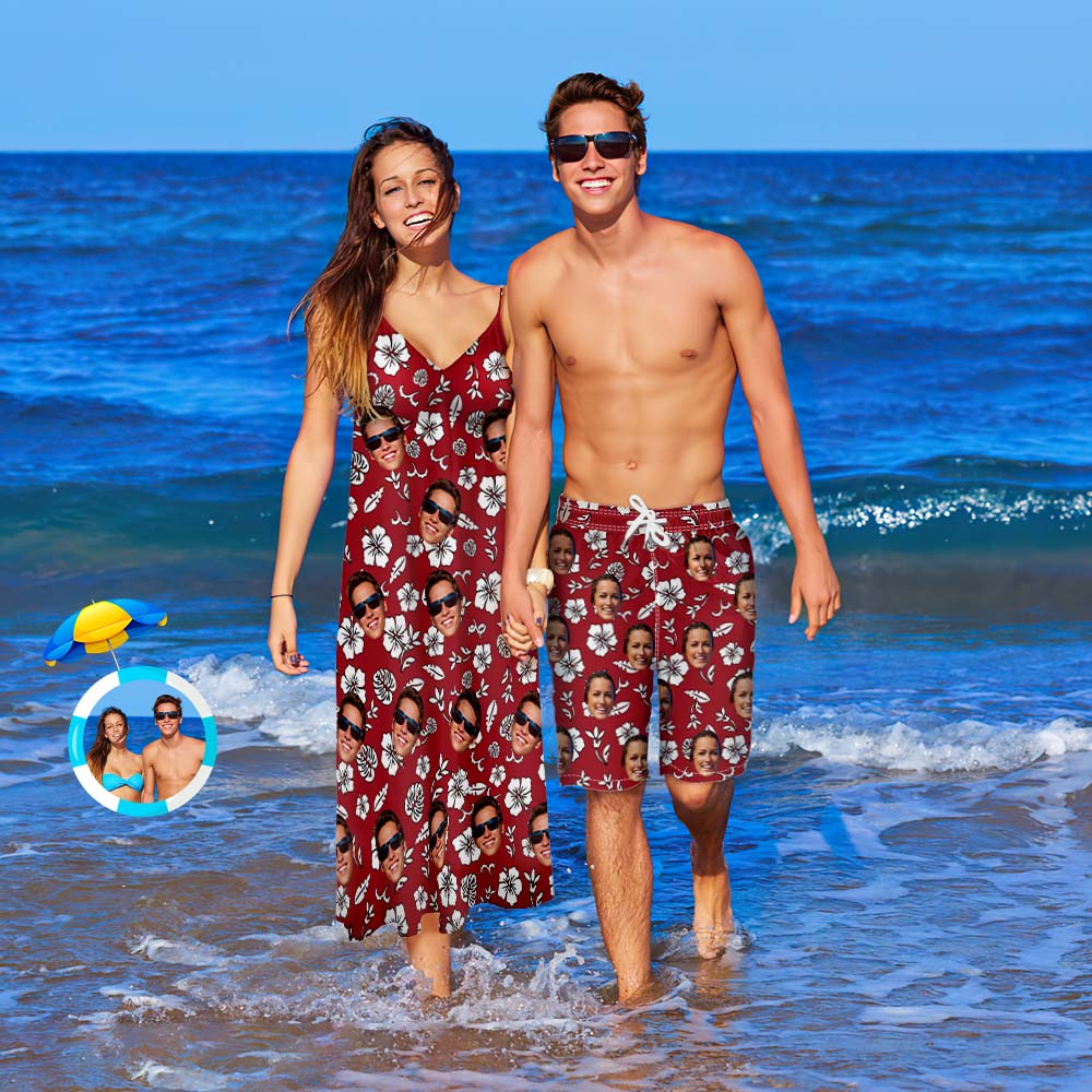 Custom Face Couple Matching Outfits Red Flowers Beach Wear Set