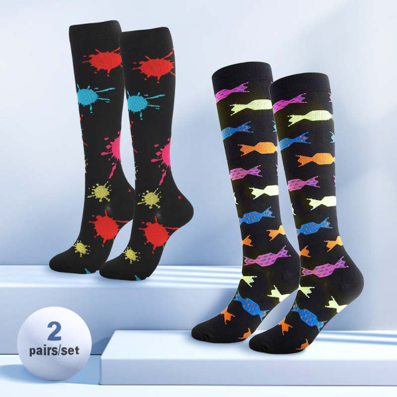 2 Pairs/pack Compression Socks Women Men Knee High Colorful Candy Doodle Sports Socks