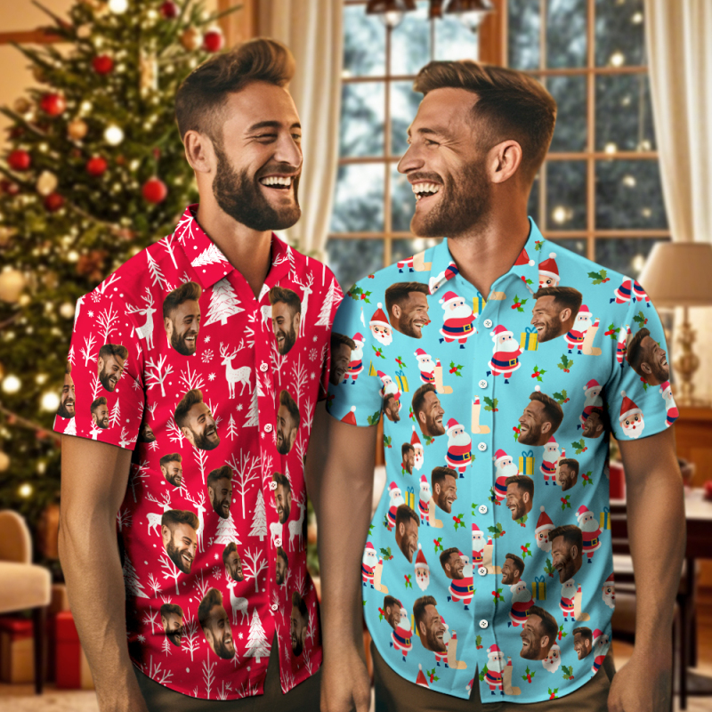 Christmas Party Shirts Custom Face Men's Hawaiian Shirt Personalized Photo Christmas Family Xmas Aloha Shirts Blue