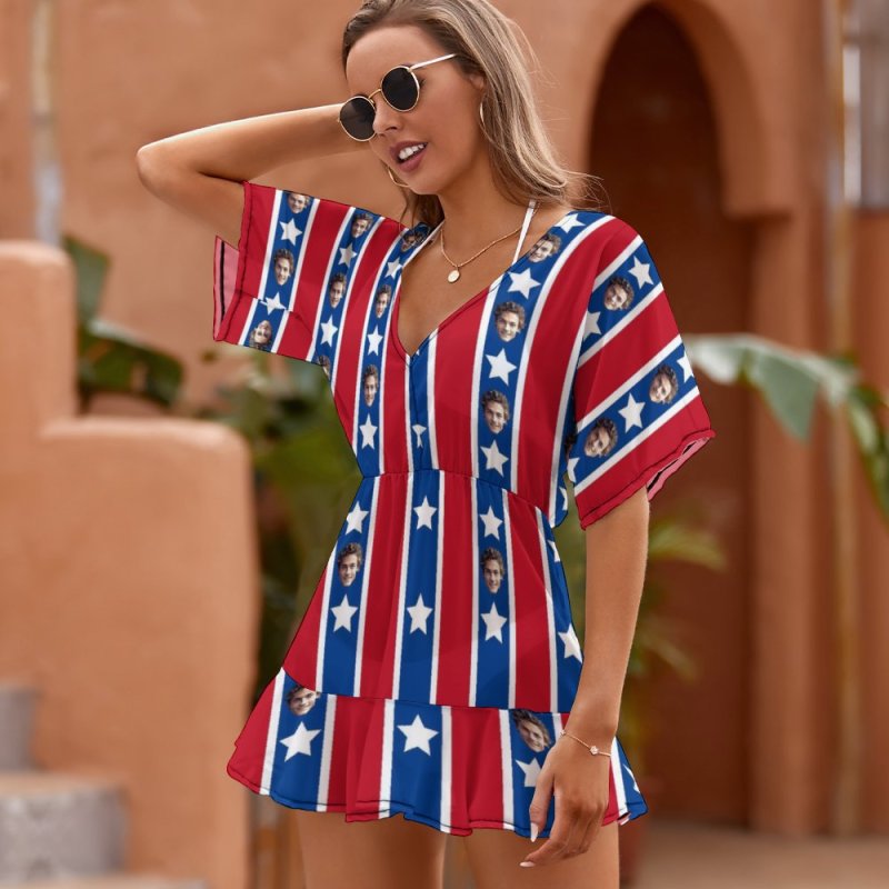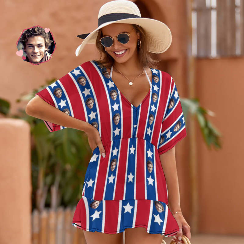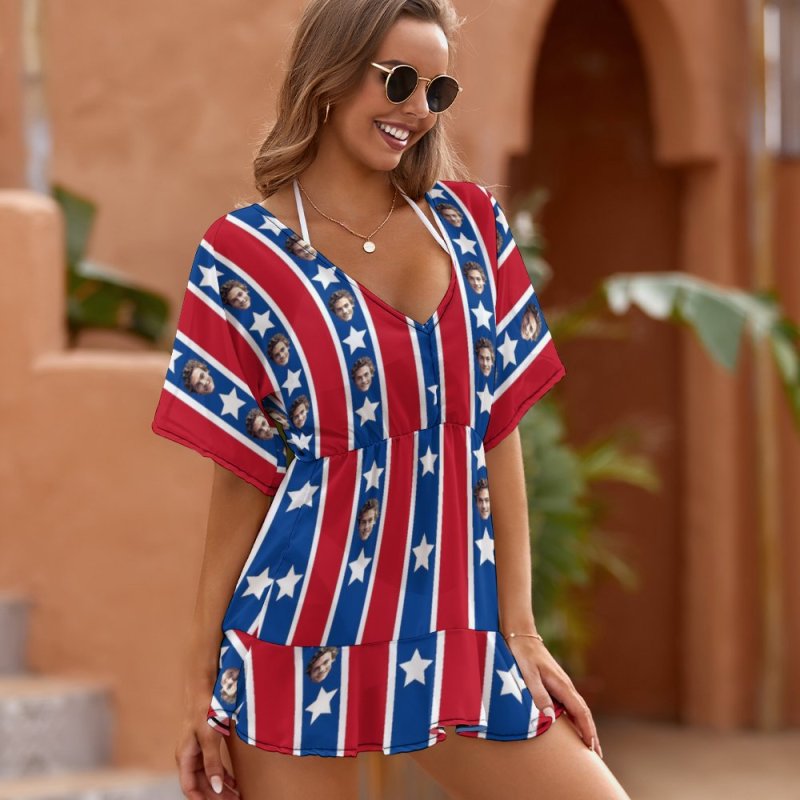 Custom Face Beach Wrap American Flag Beach Stars and Stripes Cover Ups