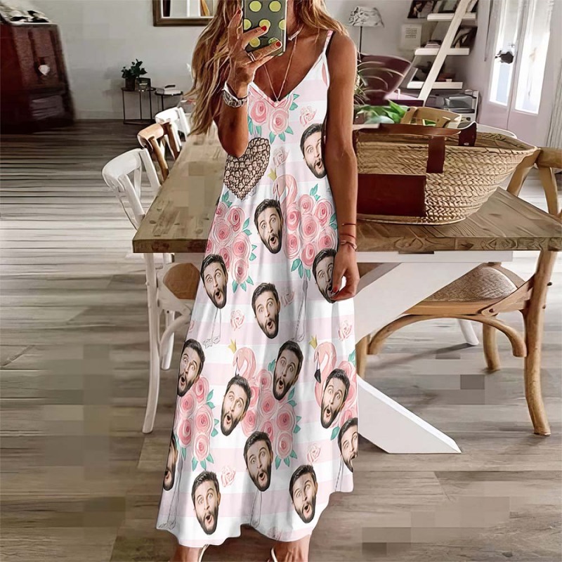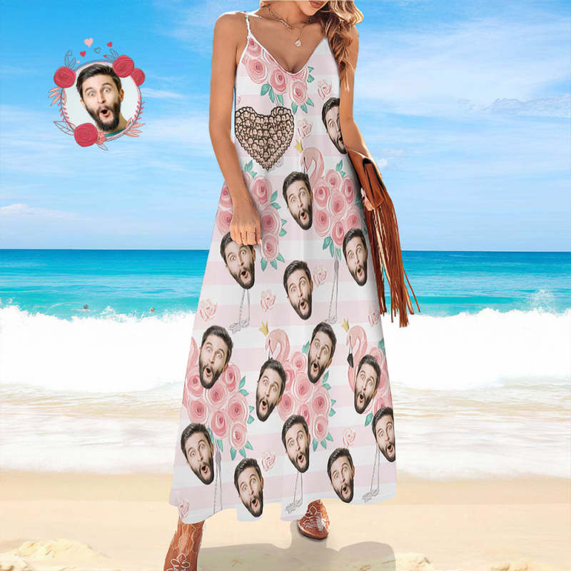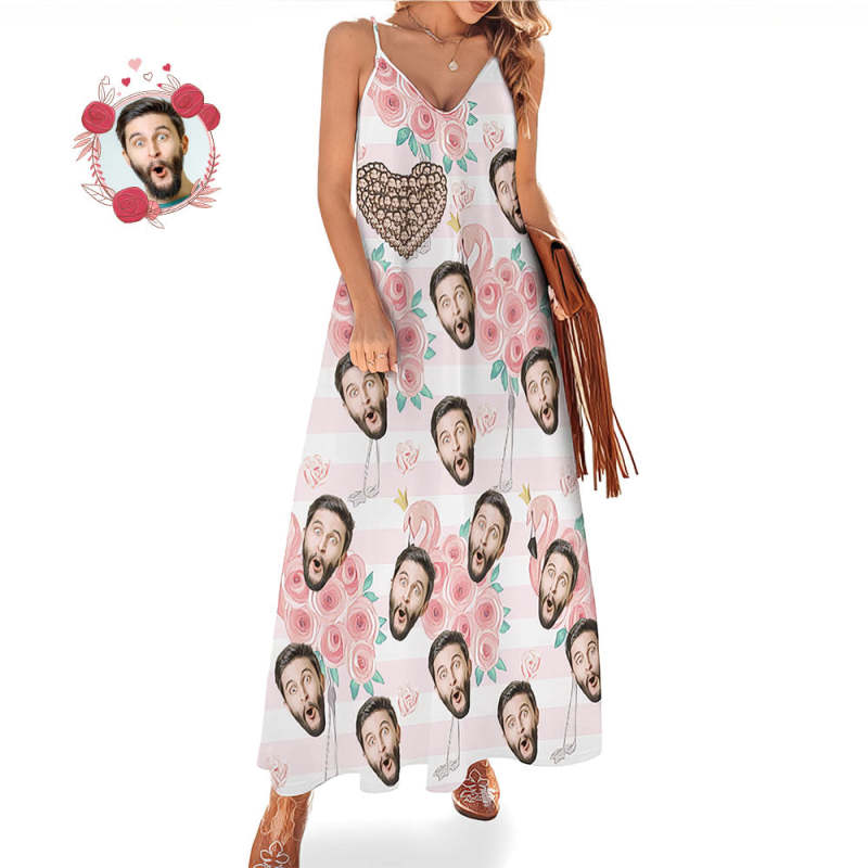 Custom Face Heart Hawaiian Style Long Dress Rose Flamingo Sling Dress