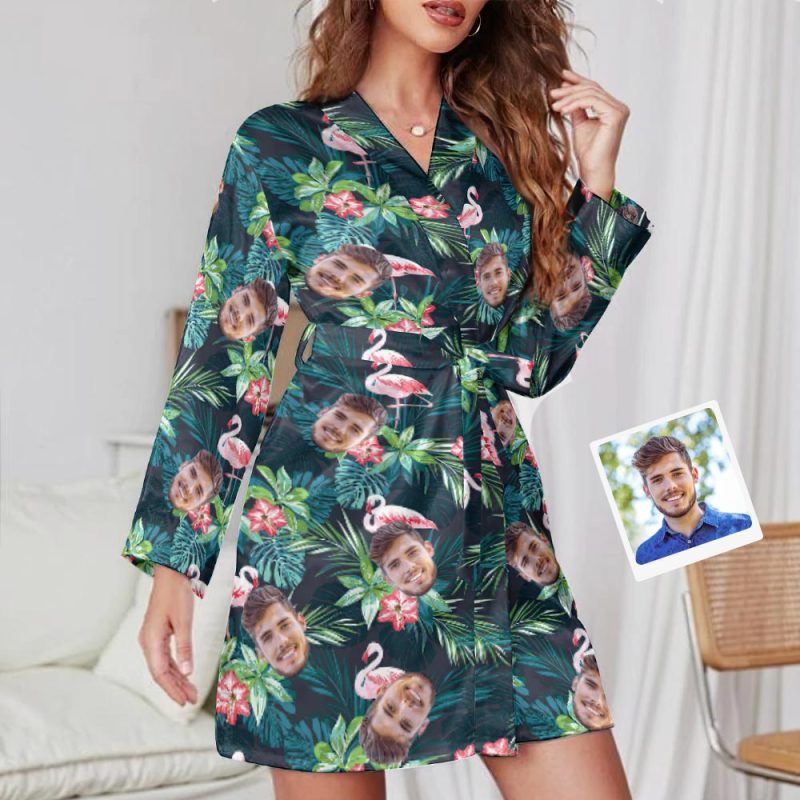Custom Face Long Sleeved Nightgown Flamingo Flowers And Leaves