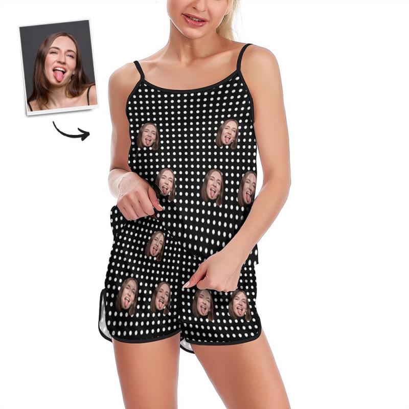 Custom Face Pajamas Suspender Sleepcoat Shorts Lingerie Set Summer Sleepwear - Polka