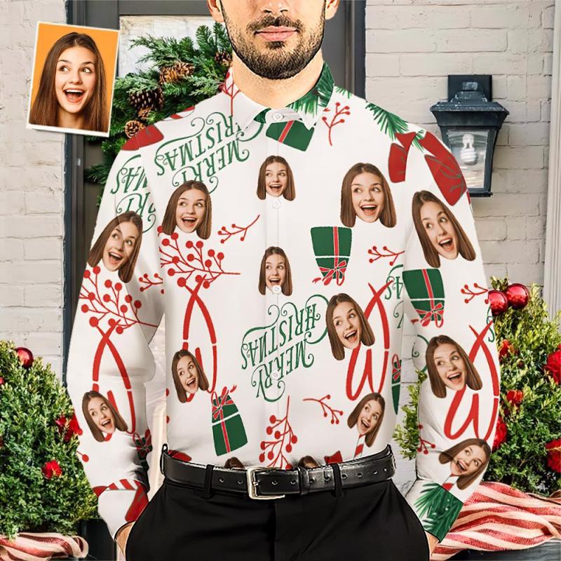 Custom Face Personalized Merry Christmas Mistletoe Men's Long Sleeve Shirt