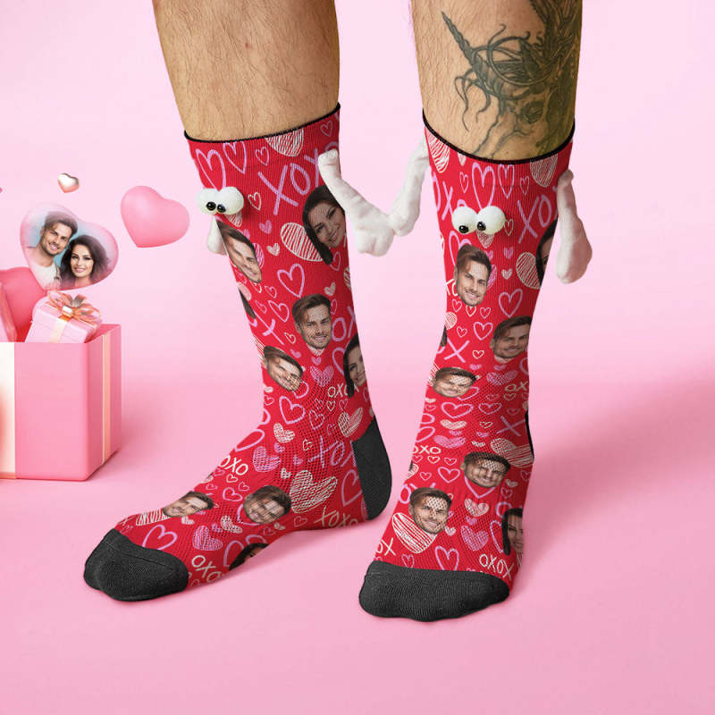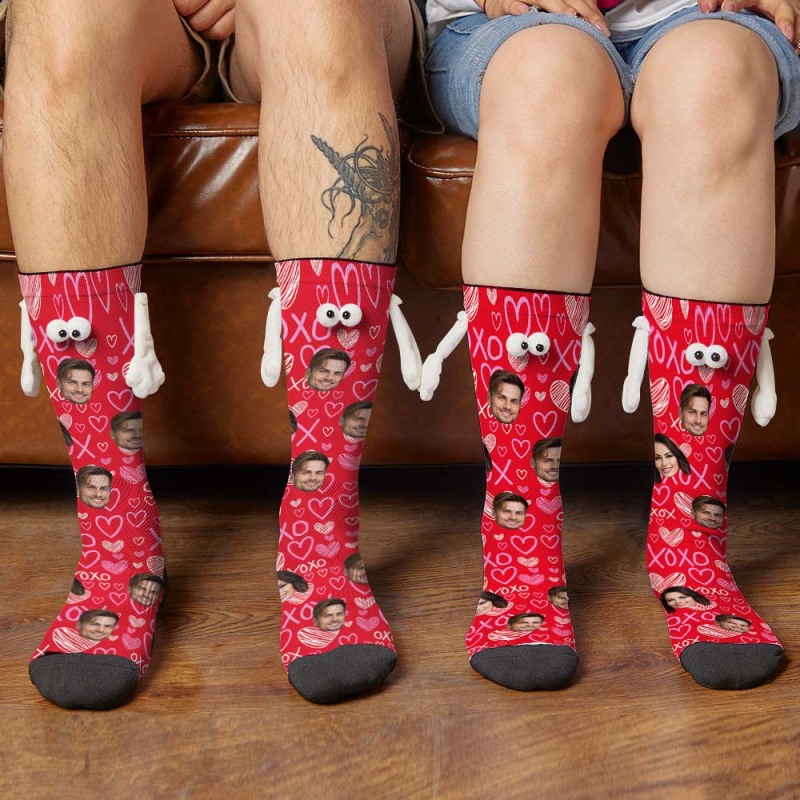 Custom Face Socks Funny Doll Mid Tube Red Socks Magnetic Holding Hands Socks XOXO Valentine's Day Gifts