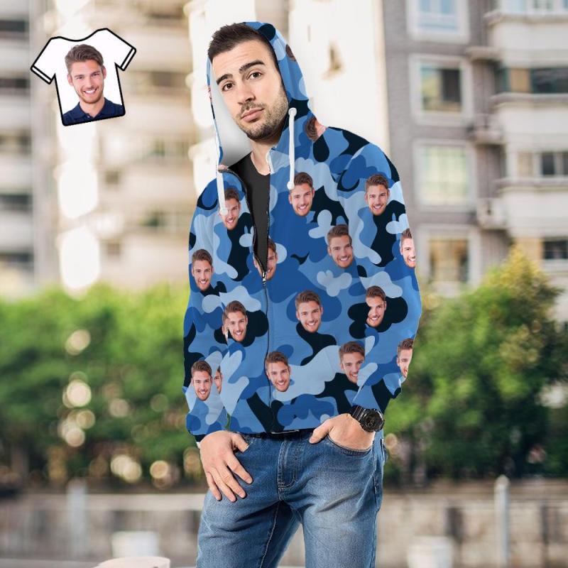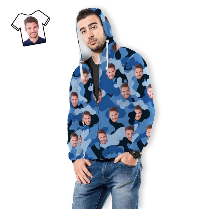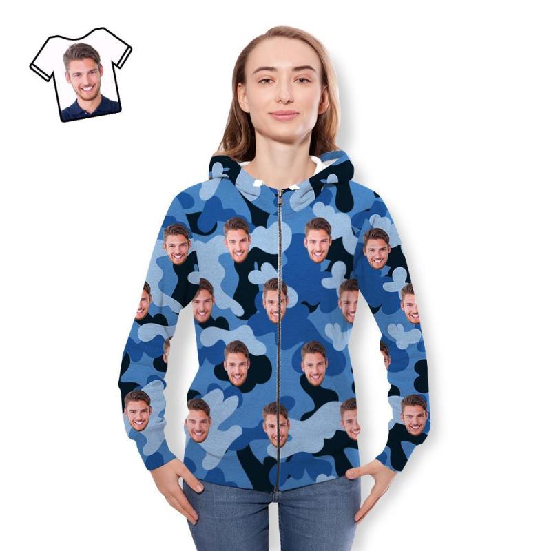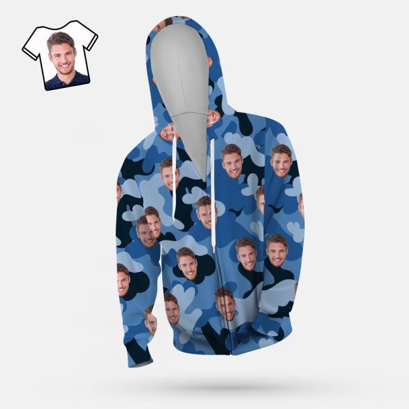 Custom Face Unisex Hoodie Casual Printed Light Sky Blue Camouflage