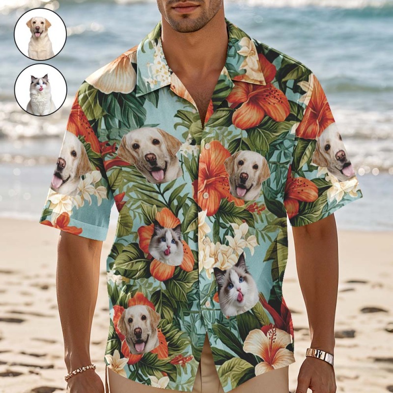 Custom Hawaiian Shirt Red Flowers Personalized Photo Hawaiian Shirt Funny Vacation Party Shirts For Pets Lovers