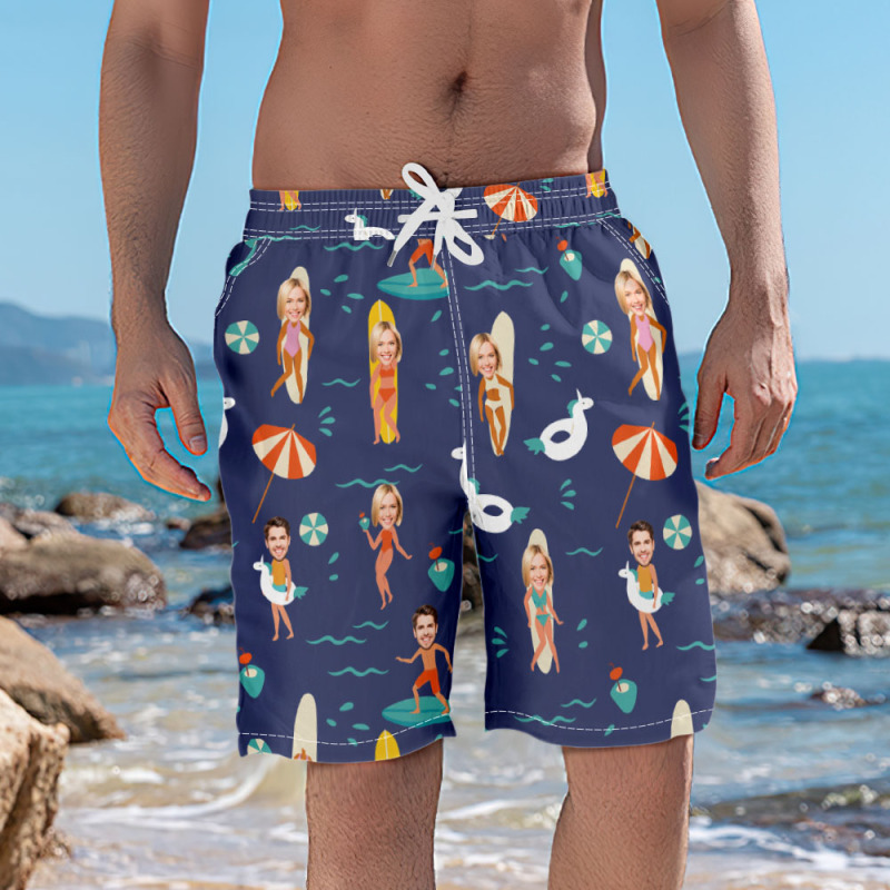 Custom Light Blue Face Mens Swim Trunks Personalized Tropical Swim Shorts Bathing Suit