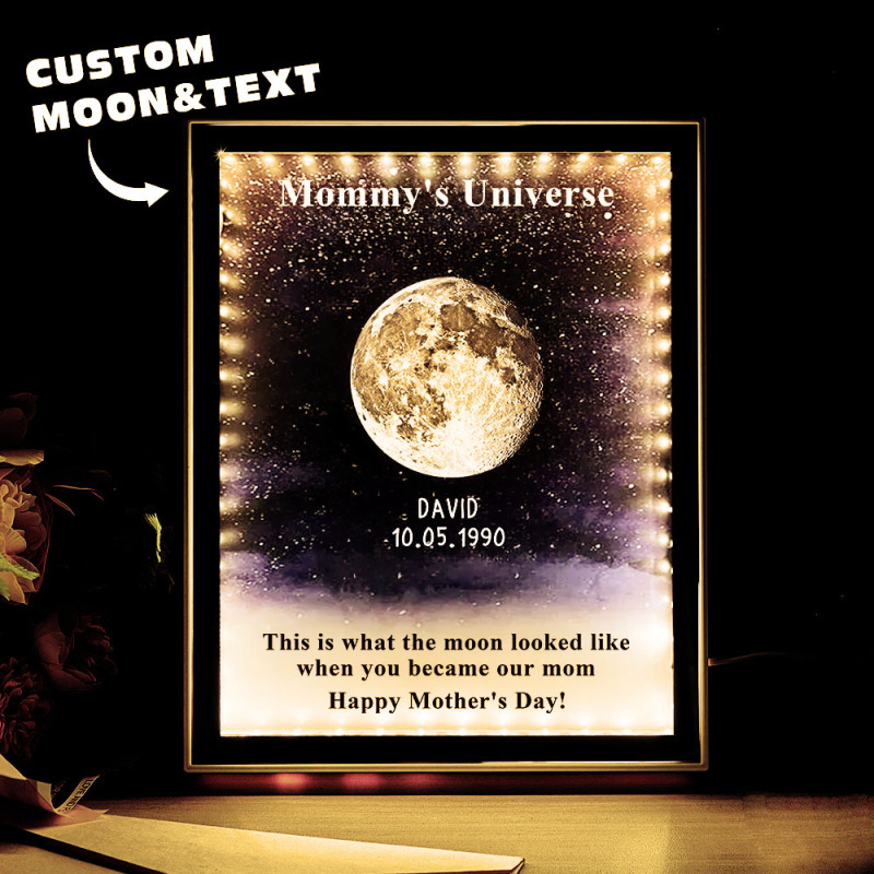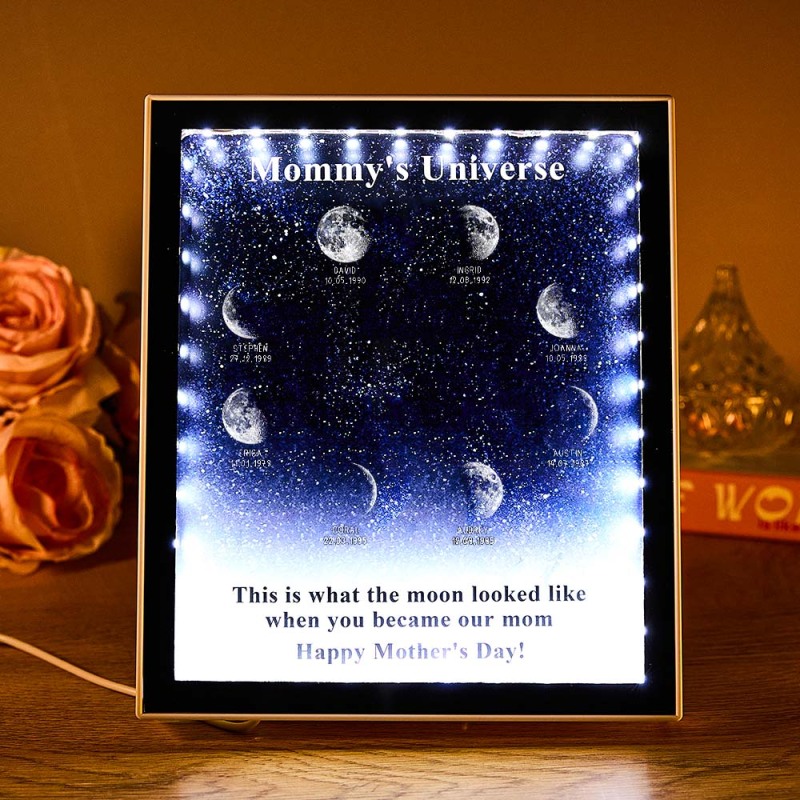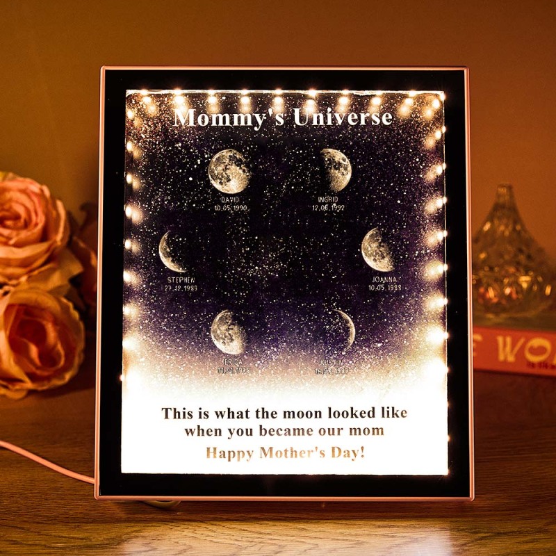 Looking for a one-of-a-kind Mother's Day gift that will leave Mom starstruck? Our Mommy's Universe Mirror Lightbox is the perfect way to show her just how much she means to you. Complete with customizable moon phases, children's names, and birth dates, this dazzling décor piece is designed to celebrate the guiding light she's always been.