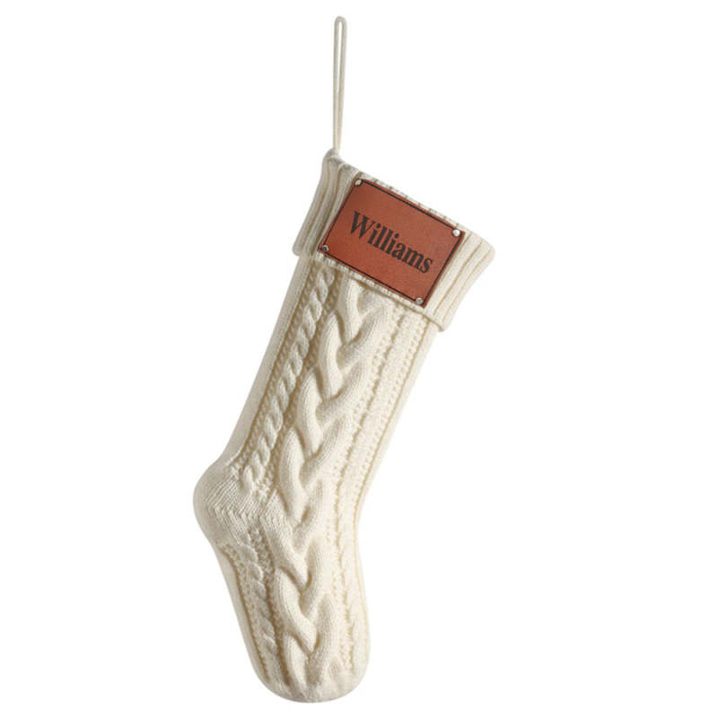 Elevate your holiday decoration with our custom knit stockings adorned with leather patches. Measuring 18 inches in length and 4.7 inches in width, these stockings are spacious enough to hold toys, candies, and surprises. Imagine the joy on your kids' faces when they discover their personalized stockings on Christmas morning!