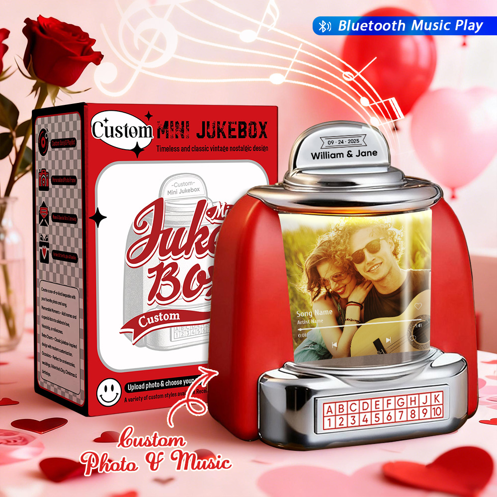 Personalized Mini Jukebox with Lover Photo & Bluetooth Music Player – Custom Jukebox Gift for Couples, Romantic Moments, Anniversaries Valentine's Day & Home Decor