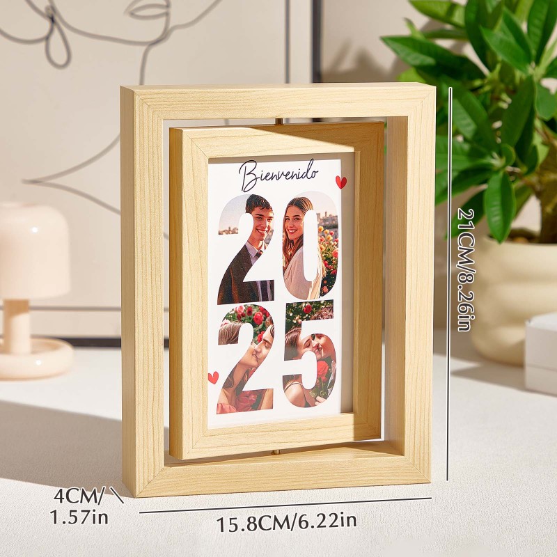 - Capture and showcase your cherished memories with this custom rotating wooden picture frame, designed to beautifully display your favorite photos. Featuring a double-frame structure, this elegant and modern design allows smooth rotation, creating a dynamic visual effect. The 2025 cutout photo collage makes it a perfect keepsake for welcoming the new year, celebrating special moments, or gifting to loved ones. Crafted from premium natural wood, this frame blends seamlessly into any home or office decor. Whether for anniversaries, birthdays, weddings, or holiday gifts, this unique photo display is a heartfelt way to relive your best moments.