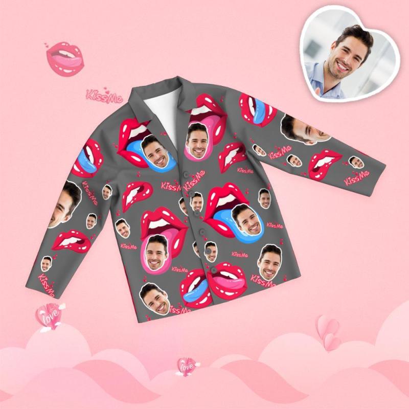 Valentine's Day Custom Face Tongue Kiss Printed Long Sleeve Pajamas